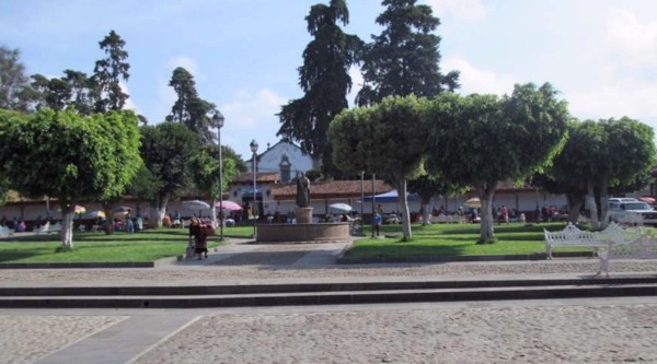 Santa Fe de la Laguna, Plaza con estatua de Vasco de Quiroga. (Foto de la autora de este escrito)