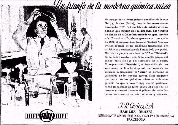 Siguiendo investigando en las hemerotecas encontré una referencia al gran descubrimiento para combatir el escarabajo de la patata, el llamado D.D.T., con fecha 27 de mayo de 1945; el mejor invento no sólo para acabar con dicha plaga sino también con toda la vida en el planeta, como veremos más adelante, que ya puestos a matar el ser humano en eso es especialista. En concreto la noticia hacía referencia a un aviso de la Jefatura Agronómica a los agricultores catalanes sobre el nuevo producto y donde indicaba: “El agricultor debe comprobar previamente, por medio de análisis, la riqueza del insecticida a emplear, sin lo cual se expone a un fracaso y a un dispendio inútil”, para ello remitía a los interesados al Laboratorio Agronómico Provincial donde se harían los análisis pertinentes por “procedimiento de propia investigación”, lo que me causa terror el pensar que saldría de allí, teniendo presente que España, en aquellos momentos, era un erial de cultura de todo tipo.