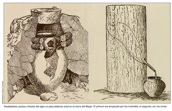 A finales del siglo XIX, el etnógrafo Carl Lumholtz recorrió la sierra del Nayar y fue grande su asombro al encontrar que en esa inhóspita región los huicholes empleaban un método sencillo para destilar cabezas machacadas y fermentadas de una planta semejante al agave (sotol, Dasylirion wheeleri). Gracias al uso de ollas y al horneado del sotol en vaporeras, se condensaba el tuchi, licor suave listo para su consumo inmediato y que era raro que se destilara por segunda vez. Estos métodos sencillos para preparar bebidas alcohólicas a fines del siglo XIX indican que es posible que se emplearan técnicas semejantes en la época prehispánica para elaborar bebidas derivadas del agave cocido y fermentado mediante la evaporación y el uso de vasijas de cerámica.[7]