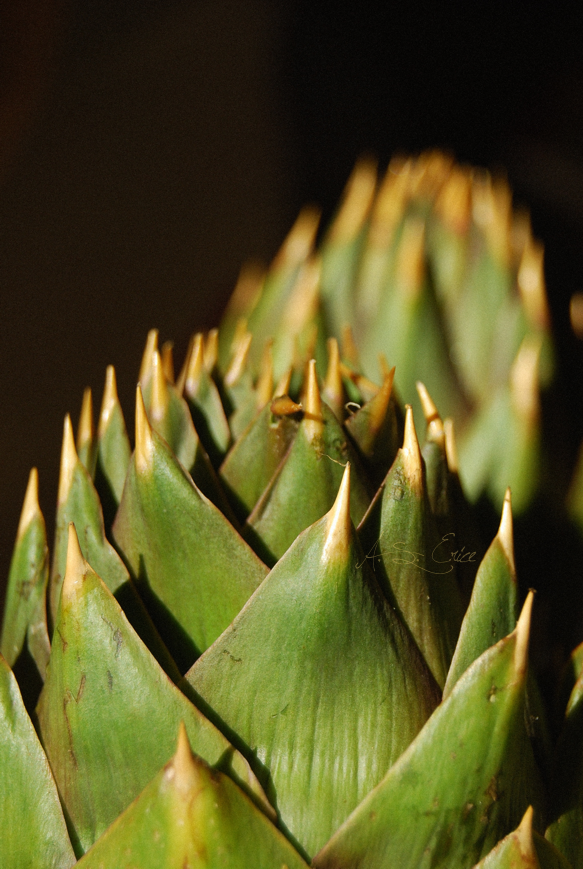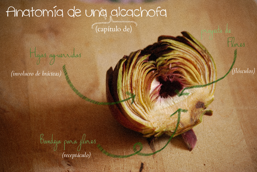 No hay una única alcachofa, por cierto; hay distintas variedades (que imagino en realidad no se llamarán variedades en sentido biológico estricto, sino cultivares, o algo así…), algunas más agresivas que otras (si las bolsas de plástico hablasen, lo que os contaría una que yo me sé sobre su encuentro con buenos quilos de alcachofas espinosas…). Pues sí, las hay muy bien armadas, que para algo son familia de los cardos borriqueros y demás vegetales de aspecto poco amigable que protegen a sus corros de florecillas con capas y capas de escamas (brácteas) afiladas.