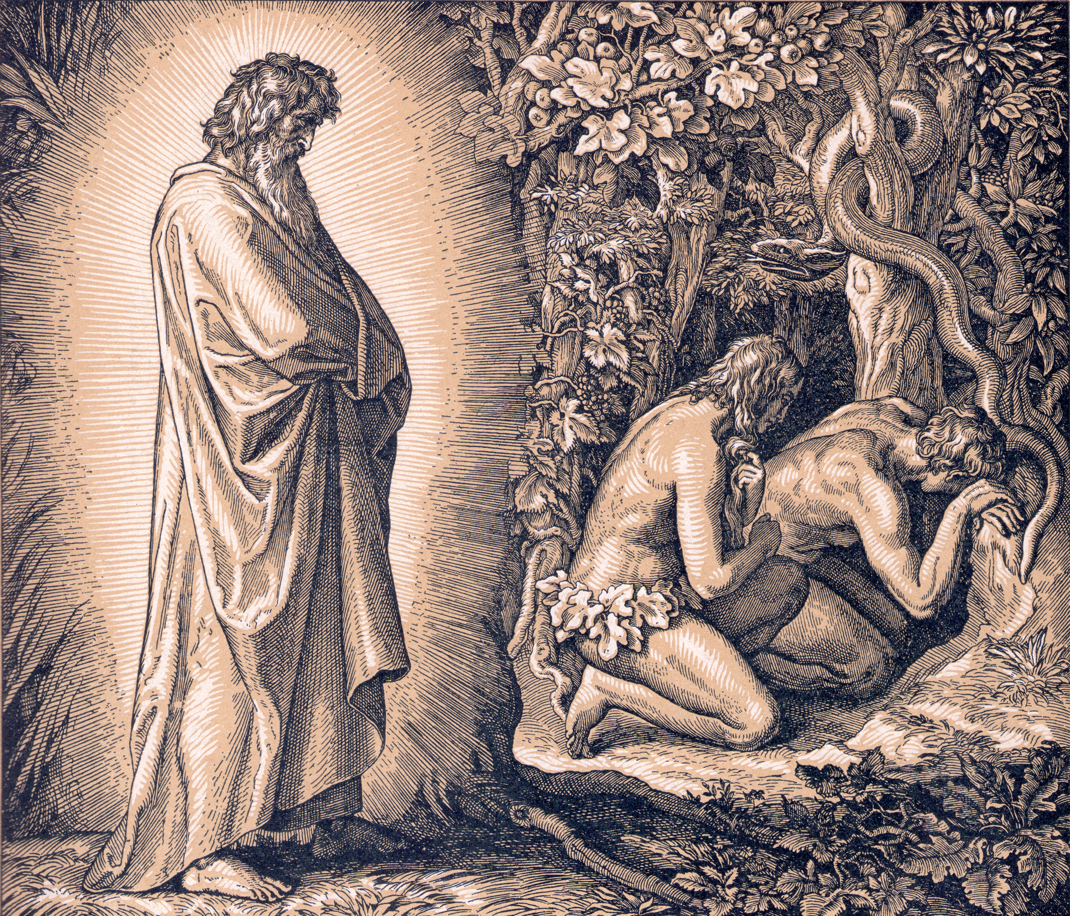 Dios creó a Adán y Eva vegetarianos y los hizo vivir en un vergel en armonía con los animales y, a diferencia con los otros seres vivos, qué sólo podían comer hierbas, les permitió alimentarse de simientes y el fruto de los árboles (Génesis 1,29), toda una quimérica armonía con la naturaleza; también les prohibió el fruto de dos árboles, un alimento reservado al perecer a los dioses, el primero de ellos daba el conocimiento sobre el bien y el mal (toda una alegoría a la inocencia perdida y el poder de los alimentos para los humanos), una vez que comieron de él la serpiente los tentó para comer del segundo de ellos, el árbol de la vida, y entonces Dios dijo: “He aquí el hombre, es como uno de nosotros que conoce el bien y el mal: ahora pues, que no alargue la mano y tome también del árbol de la vida, y coma, y viva para siempre” (Génesis, 3,22), lo que evidencia varios aspectos poco estudiados, el primero de ellos era la temporalidad o mortalidad de los seres vivos desde su creación y el otro la soberbia de un Dios con lo creado y que pese a saber, por ser Dios, del pasado, presente y futuro se sorprende de la condición humana o se sentía engañado por estos, incluso llega un momento que rehace lo creado con el Diluvio, toda una contradicción y un fallo conceptual de aquellos que redactaron la Biblia, más adelante insistiré en el tema.