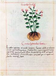 Desde el siglo XVI estas plantas medicinales mexicanas fueron dadas a conocer en Europa a través de diversos escritos. Precisamente, una de las fuentes más importantes de ese período hecha por los indígenas alumnos del Colegio de la Santa Cruz de Tlatelolco de la orden franciscana es el Libellus de medicinalibus indorum herbis (Libro de las hierbas medicinales de los indios), conocido como el Códice Badiano que permaneció mucho tiempo en El Vaticano y que fue devuelto a México en 1992 para ubicarse en el Museo Nacional de Antropología e Historia. El Códice De la Cruz-Badiano es un texto sobre la herbolaria mexica, escrito originalmente en náhuatl con la valiosa información proporcionada por el curandero indígena xochimilca Martín de la Cruz, en 1552, a los alumnos de dicho colegio. Esta información fue traducida al latín por el estudiante indígena Juan Badiano y complementada con los hermosos dibujos a la acuarela realizados por otros discípulos indígenas, que, a manera de tlacuilos, es decir, escritores dibujantes desde la época prehispánica, lo realizaron de manera excelente. (4)
