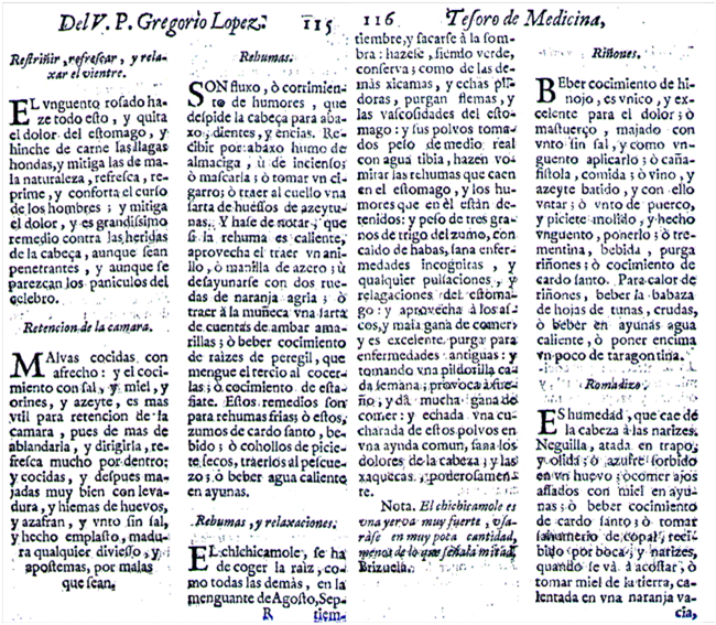 (13) Tesoro de Medicinas para diversas enfermedades dispuesto por el venerable varón Gregorio López, 3ª. Impresión, Madrid, 1708, libro original en pdf, pp. 115-116.