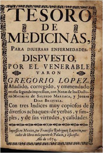 Otro texto imprescindible es el Tesoro de medicinas para diversas enfermedades  de Gregorio López, un personaje muy peculiar porque, incluso, se llegó a suponer que fue un hijo bastardo de Felipe II. Hacia 1562 arribó a la Nueva España a la edad de 20 años. Llegando a Veracruz repartió sus riquezas entre los pobres y se retiró a la vida eremítica, aunque dedicado a aprender de los indígenas sus saberes medicinales con lo que conoció las propiedades curativas de las plantas de Zacatecas, la Huasteca, Atlixco y del centro de México en el actual Estado de Morelos. Fue muy reconocido por sus sabios consejos en torno a las curaciones, por lo que muchos mandatarios y personajes importantes novohispanos acudían a él para consultarlo.