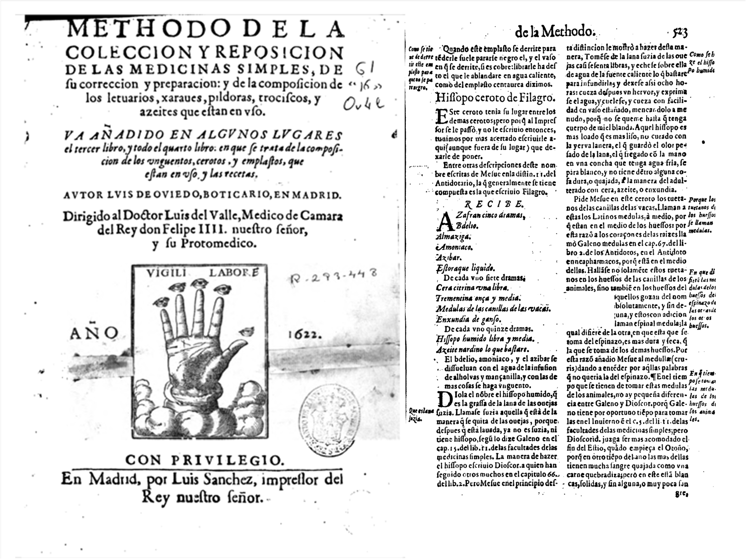 Antes de finalizar este escrito, conviene incluir algo de información de la valiosa obra Methodo de la colección y reposición de las medicinas simples, de su corrección y preparación: y de la composición de los letuarios, xaraves, píldoras, trociscos, y azeites que están en uso. Va añadido en algunos lugares el tercer libro, y todo el quarto libro: en que se trata de la composición de los ungüentos, cerotos, y emplastos, que están en uso, y las recetas de Luis de Oviedo, boticario, publicada en Madrid hacia 1622. En ésta se habla, por ejemplo, de miel de membrillos, trocitos de víbora, estoraque líquido, harina de cebada, zumo de yerba mora, zumo de endivia [escarola], zumo de verdolagas, zumo de uvas silvestres, zumo de pámpanos, hojas de rosas, vinagre, sándalo, bolos de arsénico, mucilago de zaragatona, acíbar [aloe], almáciga, cera citrina, trementina, médulas de las canillas de las vacas, enjundia de ganso, hisopo húmedo, amoniaco, aceite nardino, bdelio [bedelio], infusión de alholvas, infusión de manzanilla, azafrán, entre muchos de los géneros que incluye en su Tabla al final del libro.