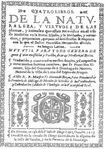 Cuatro libros sobre temas médicos de la Nueva España, recogidos por mandato de Felipe II, rey invicto de las Españas y de las Indias, por Francisco Hernández, primer doctor del Nuevo Mundo, y organizados por el doctor Nardo Antonio Recchi, médico de su misma Majestad. Traducido por fray Francisco Ximénez y publicado en la ciudad de México en 1615.