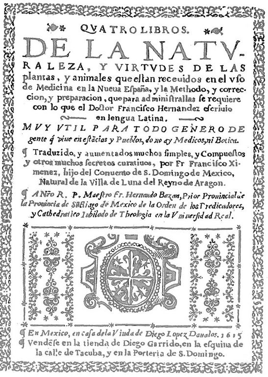 Otro libro indispensable es el del protomédico Francisco Hernández, cuyo título completo sería Quatro libros de la naturaleza, y virtudes de las plantas, y animales que están recibidos en el uso de la medicina en la Nueva España, y la método, y corrección, y preparación, que para administrallas se requiere con lo que el Doctor Francisco Hernandez escribió en lengua latina. Muy útil para todo genero de gente que vive en estancias y pueblos, do no ay Medicos, ni Botica”. Éste fue traducido por el dominico fray Francisco Ximénez y editado en la ciudad de México, capital de La Nueva España en 1615. Según refiere Xavier Lozoya: