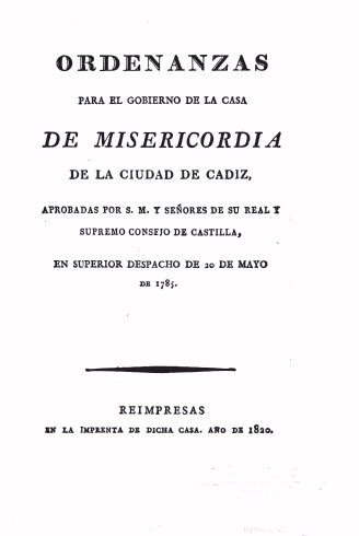 Ordenanzas para el gobierno de la Casa de Misericordia de la ciudad de Cádiz, aprobadas por S. M. y señores de su Real y Supremo Consejo de Castilla, en superior despacho de 20 de mayo de 1785. Reimpresas en la imprenta de dicha casa, año de 1820.
