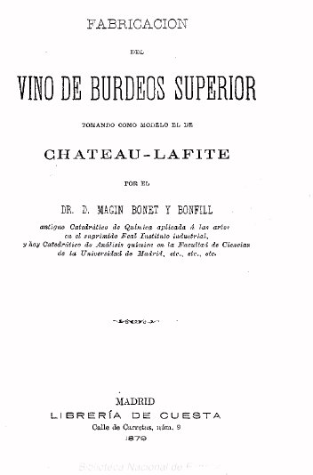 – ‘Fabricación del vino de Burdeos superior tomando como modelo el de Chateau-Lafite’. Magin Bonet y Bonfill, año 1789.