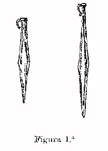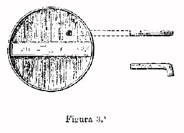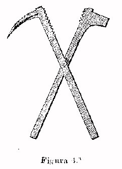 A este fin sirven las tenazas representadas por la figura siguiente (figura 4.a). Como se observa, en su extremo superior y cara interna, las dos ramas están provistas de desigualdades que semejan las de una lima gruesa, y por la externa una termina en forma de martillo y la otra en la de una azuela. Su uso es fácil de comprender. Cuando hay que colocar la cánula, se coge con estas tenazas y extremo que tiene en forma de lima, la clavija que cierra el agujero de cata, é imprimiéndole un ligero movimiento en sentido circular, pronto cede y sale tirando hacia fuera, sustituyéndola con la cánula en el acto. Como el diámetro exterior de esta es igual al de la clavija, siempre ajusta perfectamente; pero, si se quiere asegurarse bien de que así sucede, se le da un ligero golpe con el martillo, y entonces es seguro de que no habrá más salida que la de la cánula.