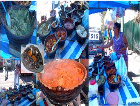 Chilaquiles en salsa verde, guiso de papa con longaniza, chicharrón en salsa picante roja, arroz con huevo y otras delicias que disfruta la comensal de tan amable señora[14]