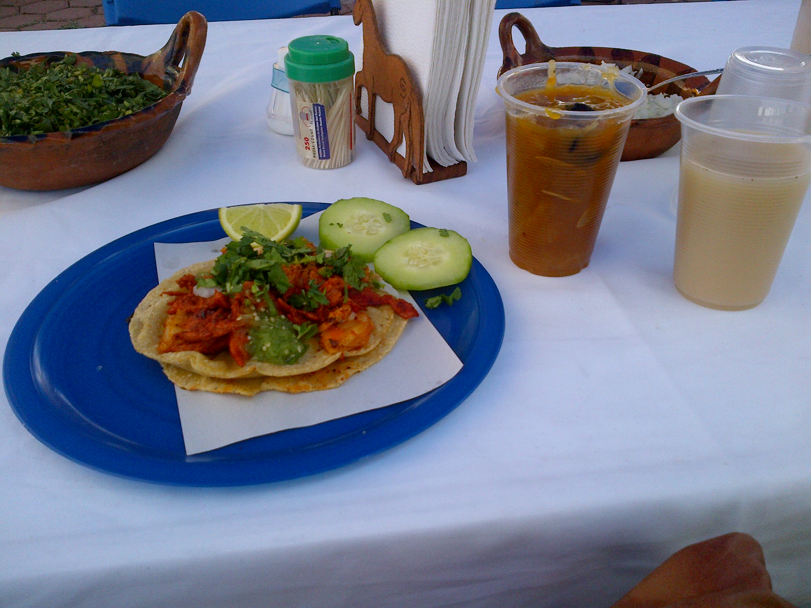 Vaso con agua de chilacayote, vaso con horchata y taco de carne enchilada poblana[6]