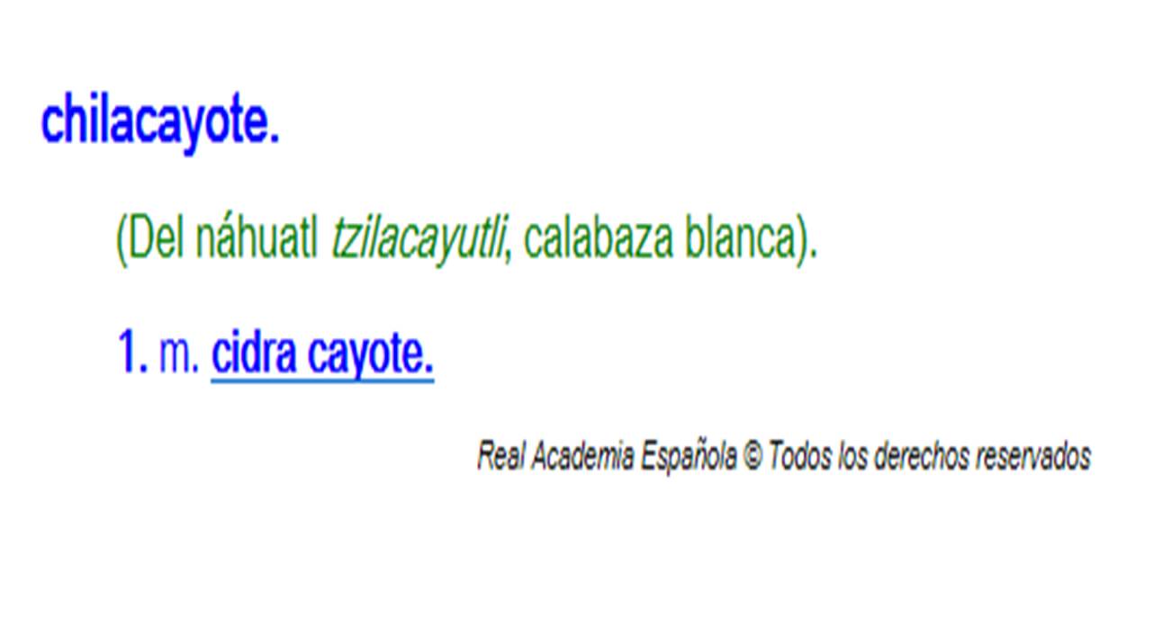 De lo que no cabe duda es que el vocablo chilacayote, usual en México al menos, procede del náhuatl (tzilac, ‘liso’, y ayotli, ‘calabaza’). En Sahagún (citado por Santamaría) se lee la siguiente definición: «hay unas calabazas lisas, redondas, pecosas, entre verde y blanco, o manchadas, que las llaman tzilacayutli, que son tan grandes como un gran melón». Ignoro si alguien en España llame cidra cayote al chilacayote. Es probable que, por no conocerlo no lo llamen de ninguna manera. Lo grave es que el error académico no termina ahí. Como escribieron cidra cayote, se vieron precisados a incluir también, como entrada, la voz cayote (!), a la que se le asigna origen náhuatl (!) y, además, el significado de ‘chayote’ (!!). En resumen: el chilacayote no tiene nada que ver con la cidra; no hay algo que se llame *cidra cayote; las raíces de chilacayote son tzilac y ayotli (‘calabaza’); por tanto no existe, ni como raíz náhuatl, la voz *cayote; y, por último, si existiera, no tendría nada que ver con chayote, cuyo origen está en el náhuatl chayutli, muy diferente de ayotli (‘calabaza’).[2]