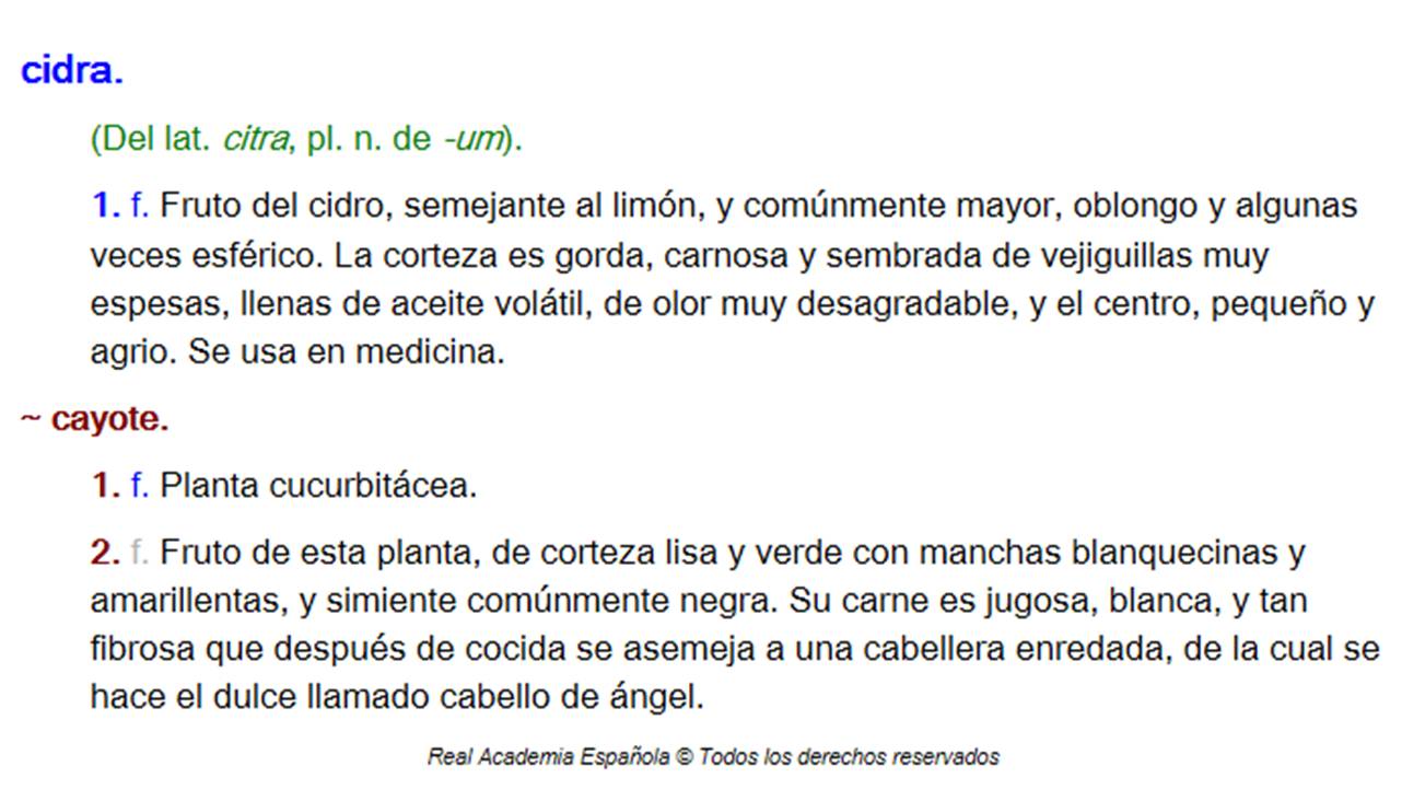 ES NOTABLE QUE UN CRASO ERROR del DRAE, señalado hace más de cien años por Baldomero Rivodó (Voces nuevas de la lengua castellana, París, 1889), y después de él por otros muchos, persista muy campante en la vigésima primera edición (1992). Ciertamente la mayoría de las sugerencias de modificaciones, supresiones y adiciones que envió a la madrileña la Academia Mexicana fueron atendidas precisamente en esa entrega. Sin embargo, el caso que voy a tratar en esta nota no forma parte de esas papeletas por la simple razón de que la Academia Mexicana se limitó, en lo que respecta a modificaciones y supresiones, a remitir sugerencias referentes a entradas que tuvieran que ver, directa o indirectamente, con mexicanismos, señalados como tales por la corporación madrileña. Pues bien, en la entrada cidra cayote no se hace referencia alguna en el lexicón académico a México.