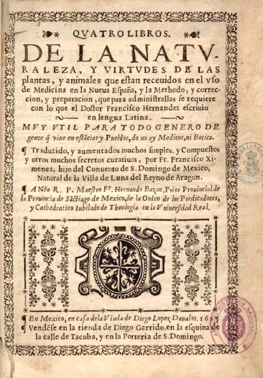 Pero si pensó que ya con esto estaba todo terminado le aconsejo que ahora se ponga cómodo porque lo mejor lo he dejado para el final, la trascripción de un libro fechado en el año 1615 y que lleva el siguiente largo título: ‘Cuatro libros de la Naturaleza, y virtudes de las plantas, y animales que están recibidos en el uso de la medicina en la Nueva España, y el método, y corrección, y preparación, que para administrarlas se requiere con lo que el Doctor Francisco Hernández escribió en lengua latina’, apostillando: «Muy útil para todo género de gente que vive en estancias y pueblos, donde no hay médicos ni botica«, para seguir diciendo: «Traducido, y aumentados muchos simples y compuestos y otros muchos secretos curativos, por Fr. Francisco Ximenez, hijo del Convento de Santo Domingo de México, natural de la villa de Luna del Reino de Aragón«. Dedica el libro a R. P. Maestro Francisco Hernando Bazán, Prior Provincial de la provincia de Santiago de México, de la Orden de los Predicadores, y Catedrático Jubilado de Teología en una Universidad Real. Se editó el libro en México, en casa de la Viuda de Diego López Dávalos y se vendía en la tienda de Diego Garrido, en la esquina de la calle de Tacuba, y en la portería de Santo Domingo.