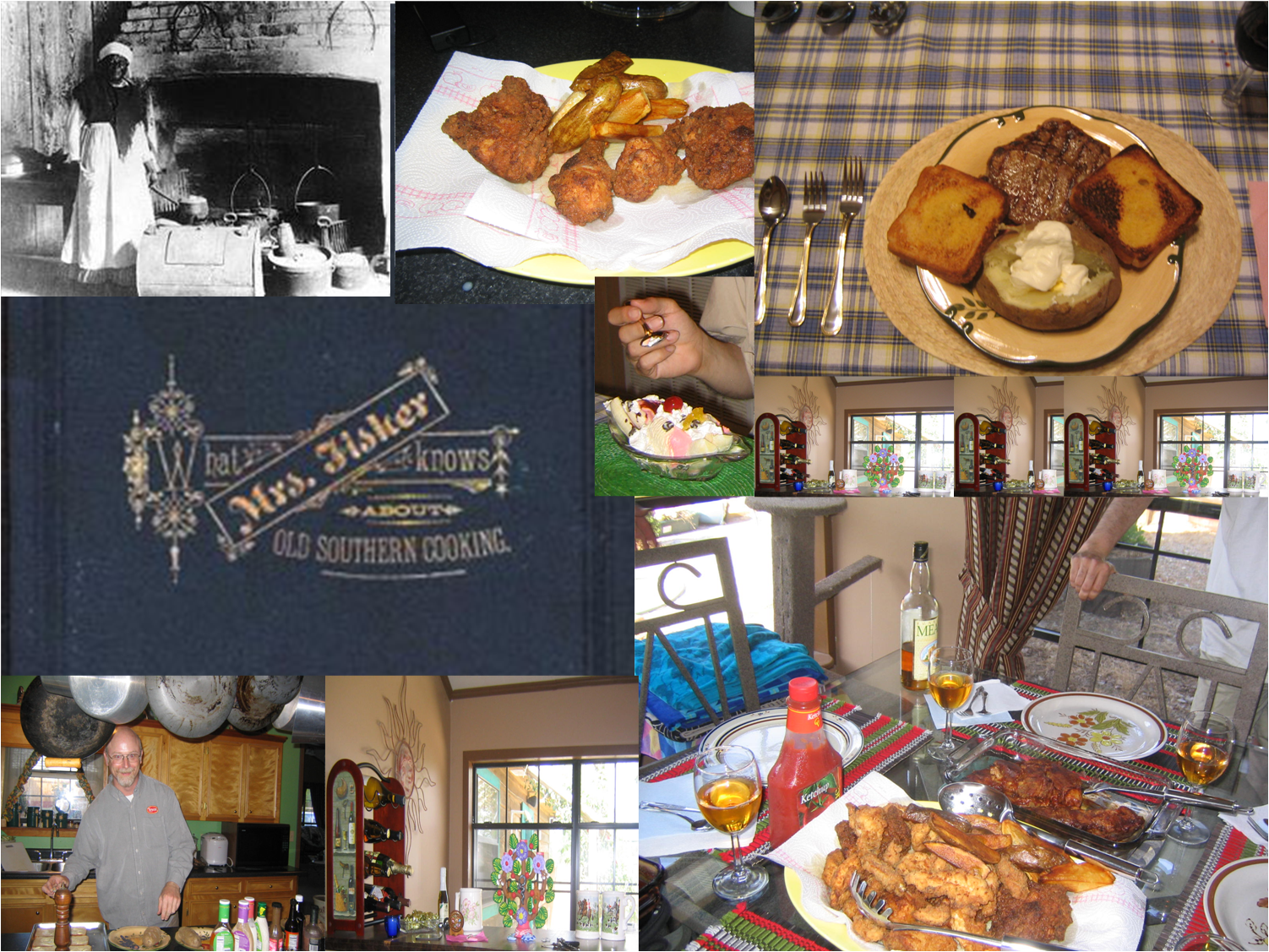 Pienso en establecimientos en donde venden el pollo frito estilo Kentucky y me percato de que sigue recetas que han formado parte de la tradición alimenticia de los vecinos del sureste estadounidense desde hace siglos. Tengo revisado un libro muy interesante, What Mrs. Fisher Knows About Old Southern Cooking, escrito por Abby Fisher, una ex esclava negra afroamericana nacida en Alabama, quien, luego de la Guerra de Secesión, se fue a vivir a San Francisco, California, en donde se volvió sumamente famosa por la la excelente manera de preparar los alimentos, los asados, los postres, las jaleas, las gelatinas, los pasteles y las bebidas al estilo sureño, razón por la cual fue publicado su texto en 1881. Muchas de sus recetas pueden ser consideradas del estilo Soul Food, incluso, al final del escrito, incluye remedios para los inválidos o los niños con diarrea.