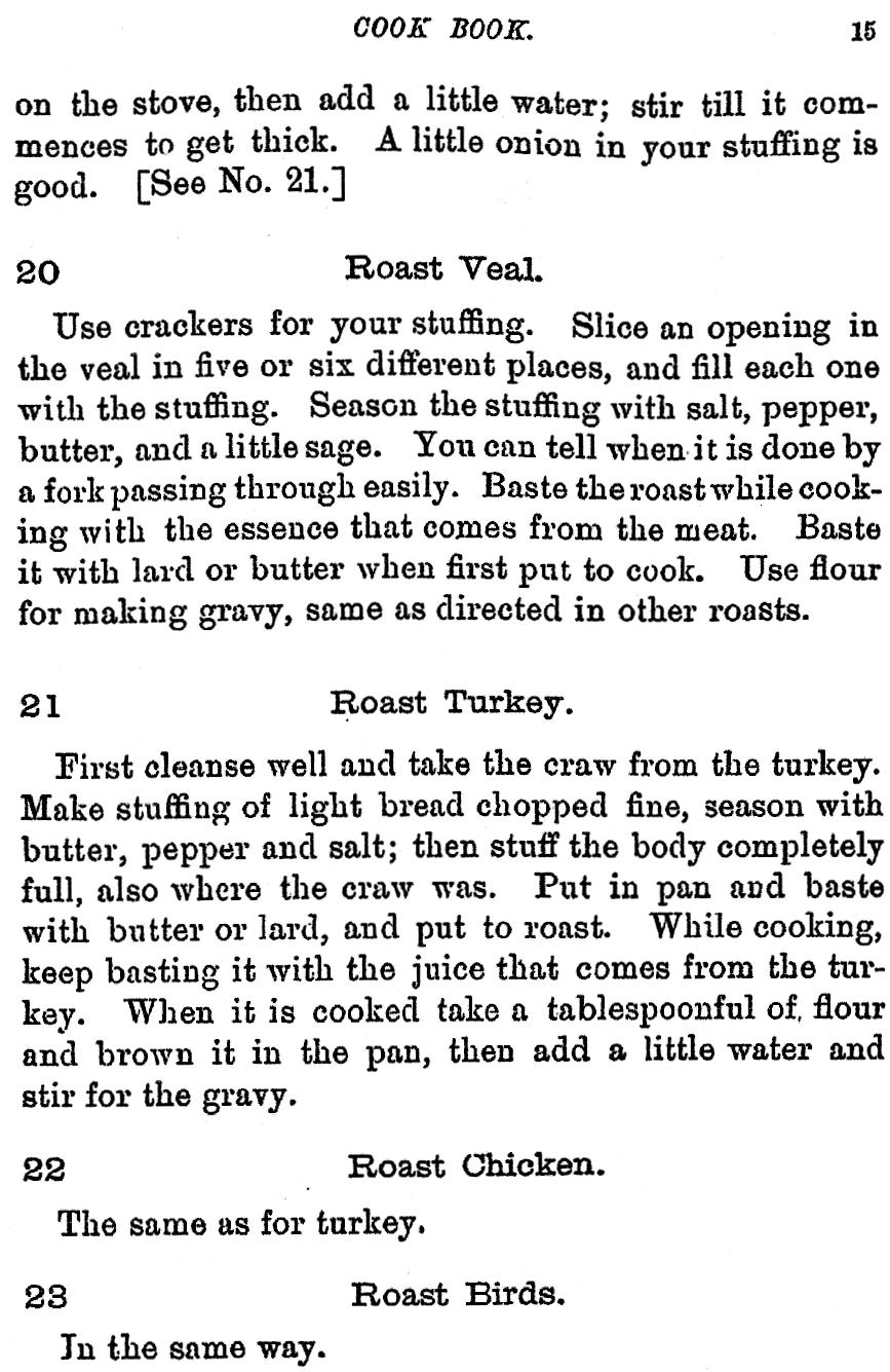Primero limpie bien y saque la tripa del pavo. Haga el relleno con light bread  [loaf bread, pan de harina de trigo leudado/fermentado con levadura de estilo del sureste estadounidense] picado fino, sazonado con mantequilla, pimienta y sal; luego rellene el pavo completamente, también donde estaban las tripas. Colóquelo en la bandeja y humedézcalo con mantequilla o manteca de cerdo y póngalo a asar. Mientras esté cocinando, manténgalo hidratado con el jugo que proviene del pavo. Cuando se haya cocinado coloque una cucharada grande de harina y dórese en el recipiente, luego añada un poco de agua y revuelva para el gravy [jugo de la carne del pavo]. [6]