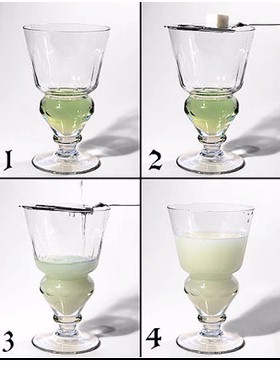 Creada en Suiza a finales de 1700 por el doctor Pierre Ordinaire, la vendían las monjas del convento de Couvet como elixir. El Mayor Dubiet adquirió la receta de las monjas y abrió la primera destilería en 1792. Pasó a Francia a mitad del siglo XIX donde se hizo tan popular que cabarets y cafés señalaban a las 5 pm como “la hora verde” convirtiéndose en la imagen de los artistas y bohemios. Baudelaire, Oscar Wilde, Verlaine, Van Gogh, Manet, Picasso, Pessoa, Rimbaud y un largo etcétera practicaban el ritual de su preparación y consumo: En La boca de un vaso con absenta se coloca una rejilla o la cuchara horadada fabricada especialmente para este fin, sobre la que se deposita un terrón de azúcar. Lentamente se va vertiendo agua fría sobre el terrón y el azúcar disuelto va cayendo sobre la absenta dándole un aspecto lechoso.