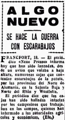 El enviado especial en Fráncfort, Ramón Garriga, daba noticias de las manifestaciones que se habían producido en la parte comunista de Berlín por las Juventudes Comunistas Alemanas que se desarrollaron a finales de mayo de dicho año y que contaba de la siguiente forma: “…denunció el jefe de la propaganda de la zona soviética, Gerhard Eisler, que aviones norteamericanos volaban sobre algunas regiones de la Alemania oriental para arrojar estos terribles escarabajos que estropean las cosechas de patatas”, algo que una mente sensata (en aquella época parece que nadie lo era, seguramente al estar aturdidos todavía por los ruidos de las bombas) debía preguntarse cuál era la razón para qué los norteamericanos arrojaban escarabajos de la patata, al puro estilo de los Hermanos Marx de ‘más madera’, si ya estaban inundados de ellos desde hacía más o menos veinticinco años.