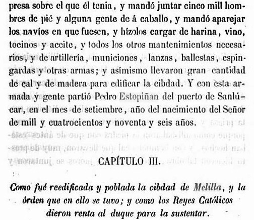 Ahora viene, para terminar, la parte más importante, porque de ahí sacaremos la conclusión final de lo que comían las tropas españolas en Melilla, ya que corrió a cargo del estado el mantenimiento por los seis primeros meses de ocupación, así como la persona encargada de ejecutar dichas ordenes y quienes tenían derecho a participar de los abastos y donde, por el escrito, sabemos que las tropas la componían un total de setecientas personas y cincuenta caballos, a los cuales se les suministró, para estos seis primeros meses, tres mil quinientas hanegas de cebada, tres mil arrobas de vino, quinientas de vinagre, doscientas de aceite, doscientas de pescado cecial, doscientas de sal, “y garbanzos y lentejas, y habas y higos, y pasas, y almendras, y miel y otras cosas de abastecimiento necesarias, las cuales ha de mandar comprar el duque a su voluntad, y ha de mandar poner recaudo en ello el obispo de Badajoz a la persona que el dejare en su lugar en Andalucía con Ximon de Briviesca. Y los maravedís que para estas cosas susodichas fueren menester, nos los mandaremos proveer. Los cuales bastimentos en este capítulo contenidos han de ser estantes para las necesidades que hubiere, y se han de entregar por ante los dichos oficiales a la persona que el duque nombrare”.