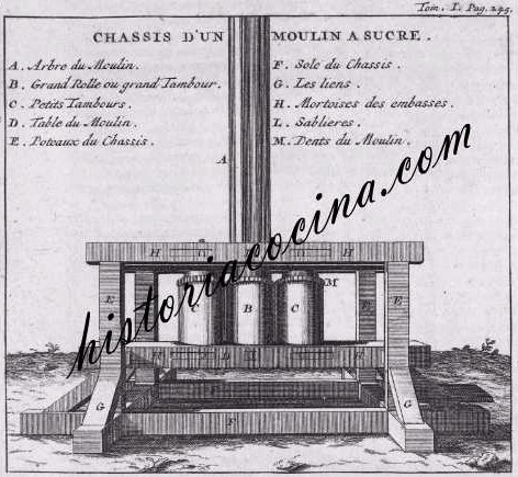 También de Ángel Muro he sacado unas interesantes anotaciones sobre la forma de fabricarlo y algo de su historia, que contada por este hombre es una delicia ya que tuvo una pluma fácil y amena, sabiendo narrar las cosas de forma que todos lo entendieran, independientemente del nivel cultural del lector y para colmo divirtiendo y así nos cuenta de como se trabajaba en los trapiches: «Se extrae de la caña dulce, de la remolacha, del maíz, de la batata, la zanahoria, el melón, etc. Se extrae  de las cañas comprimiéndolas en tres cilindros. El resultado de esta presión es una sustancia seca que se llama gabazo y sirve para alimentar el fuego de las calderas. Del primer depósito donde cae el caldo condúcenlos los operarios, a medida que se va concentrando, a otros depósitos o calderas, y de éstas a otras más pequeñas llamadas tachas, donde llegan ya con mucho punto en estado de jarabe. De allí pasa a enfriarse a otros depósitos más anchos y de gran superficie, cuyo fondo, lleno de agujeritos, da paso a la miel, en tanto que el jarabe se cuaja, formando una masa dura y compacta, la cual se rompe para llevarla a unas vasijas cónicas llamadas formas y horadadas en su parte inferior, por donde sale el líquido, a consecuencia de una fuerte presión a que se somete el todo. El azúcar piedra o candi se prepara por medio de repetidas clarificaciones y de una evaporación lenta«.
