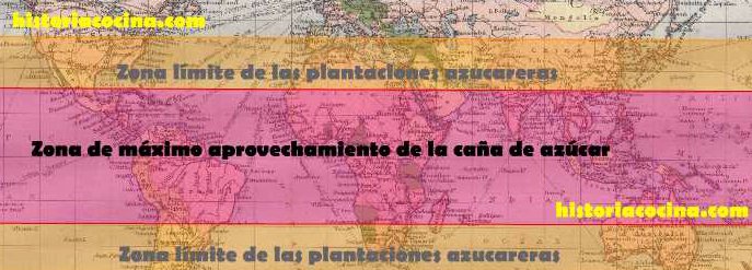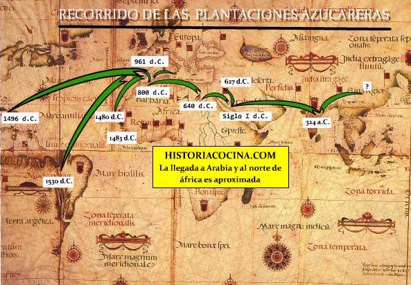 En el mapa adjunto se puede apreciar el lento avance cronológico de la caña de azúcar hasta su llegada a América y digo bien al referirme a las plantaciones de caña y no a la manufactura de esta y la obtención del preciado azúcar porque históricamente, al menos hasta el siglo VII, con los árabes, por lo escritos que nos han llegado, que se comerciara con el jugo de la caña solidificado y no elaborado, incluso, en muchos casos, ni siquiera se referían al dulzor de la caña de azúcar y sí al jugo del fresno de la India, del que se decía que goteaba el maná, o al de un tipo de arce (Acer Saccharinum), por lo que hay que tomar con cierta precaución las citas de la antigüedad, ya que incluso otros alimentos sacarosos pueden interpretarse como si fueran azucares de caña, incluida la caña de bambú y de la que tanto los médicos indios, persas y árabes utilizaron.