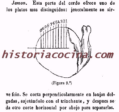 cochino6Para los ‘descubridores de la historia del jamón’ decirles que en el siglo XIX, momento en el que comienza el consumo del jamón ya como pieza alimenticia independiente de tomarla como una cecina y siendo golosina gastronómica, decirles que el corte de su carne difería mucho a la forma de hacerlo hoy y para muestra ver la captura de pantalla que acompaño, obtenida de un libro en su tiempo prestigioso, del que me reservo el nombre por el momento.