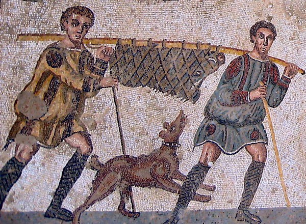 De Opiano (nacido hacia el año150 d.C), en su libro ‘De la caza y de la pesca’ habla sobre el jabalí con observaciones reales y fantásticas de la siguiente forma: “Destaca mucho entre todas las guerreras bestias salvajes. Le agrada una guarida en las más hondas profundidades de las peñas, y aborrece extraordinariamente el variado ruido de las fieras. Sin cesar anda errante en busca de la hembra y se excita mucho con el frenesí del deseo”. Continúa hablando de la cópula con la hembra a la cual, si lo rechaza, la llega a forzar o incluso matar para continuar ya con algo fantástico y que dice: “Hay un rumor respecto al jabalí salvaje, que su blanco colmillo posee dentro una fiera fuerza secreta de fuego. Existe una prueba muy visible de esto para los hombres, bien fundamentada. Pues cuando una compacta turba de cazadores con sus animosos perros tiende al animal en tierra, y lo someten disparándole una y otra vez sus largas lanzas, entonces, si uno arranca un fino pelo del cuello y lo aproxima al colmillo de la bestia aún agonizante, inmediatamente el pelo se prende fuego y se curva; y en los dos costados de los mismos perros, donde de han clavado los fieros colmillos de las mandíbulas del jabalí, quedan impresas unas quemaduras sobre la piel”. Claro está que muy pocos osarían hacer el experimento con un animal tan bravo y peligroso, de ahí el engaño.