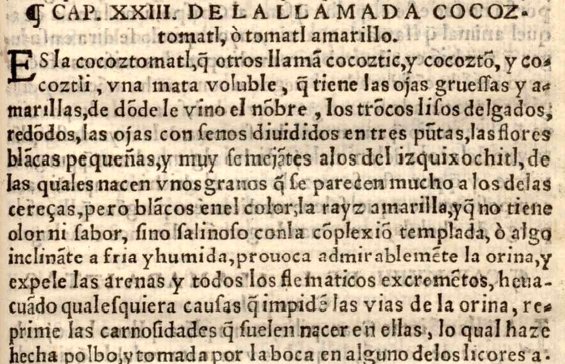 En lo referente al tomate, lo encontramos en dicho libro porque nos da idea de la cantidad de plantas de esta fruta que existían y también desvela un misterio que siempre me intrigó y me explico: Los italianos adoptaron un tipo de tomate amarillo que se aleja de la idea que tenemos sobre esta fruta, de ahí el nombre que le pusieron de ‘pomo d’oro’, más tarde pomodoro, algo que no encajaba pese al latrocinio histórico que quieren hacer sobre el uso del tomate, un pueblo que debía pensar, en aquella época, que el Nuevo Continente era algo abstracto y difuso pese a que los armadores de barcos de Sevilla eran casi todos de dicho país. Debía haber algo que encajara como un puzle para justificar ese consumo, algo que creo haber descubierto tras la lectura del Libro I, capítulo XXIII, titulado ‘de la llamada cocoztomalt, o tomalt amarillo’, porque en ese lugar se cuenta, para sorpresa de todos, que dicha planta, que se llamaba en México también cocoztic, coccozton, y cocoztli, era de hojas gruesas y amarillas que daba un fruto del tamaño de las cerezas, blancas y de raíz amarilla, sin sabor ni olor y que definía “con la complexión templada, o algo inclinante a la fría y húmeda” y que provocaba la orina, ayudaba a expeler las arenas, limpiando todo el conducto urinario, de modo que tomado por la boca “en algunos de los licores acomodados en la cantidad de media onza, y también mezclando el polvo de la misma raíz con una clara de huevo, o con aceite de almendras dulces, dándole muchas vueltas con un hilo de algodón, metido así por las vías de la orina”.