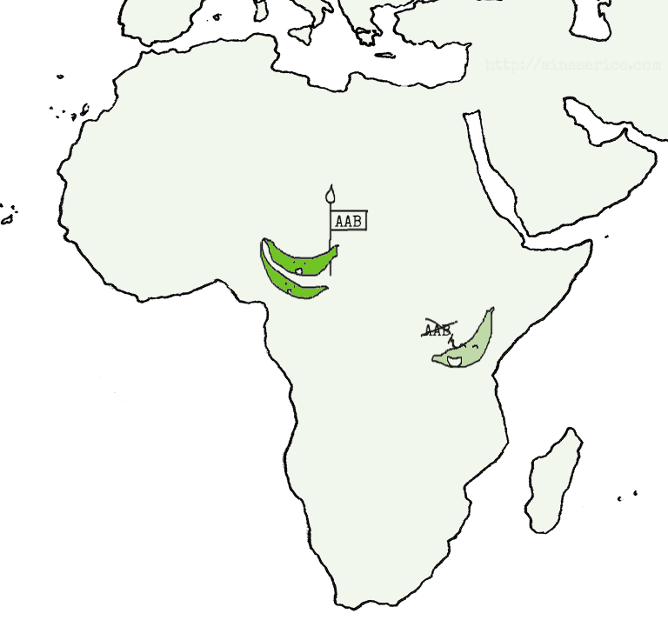 Por lo que he leído, se diferencian dos grandes ramas de “plantains” AAB: 1) las africanas, y 2) las pacíficas. Sin embargo, y pese a que en ambas ramas las letras sean iguales, las procedencias de cada juego de cromosomas son un poco distintas, lo que hace pensar en orígenes separados para cada grupo.