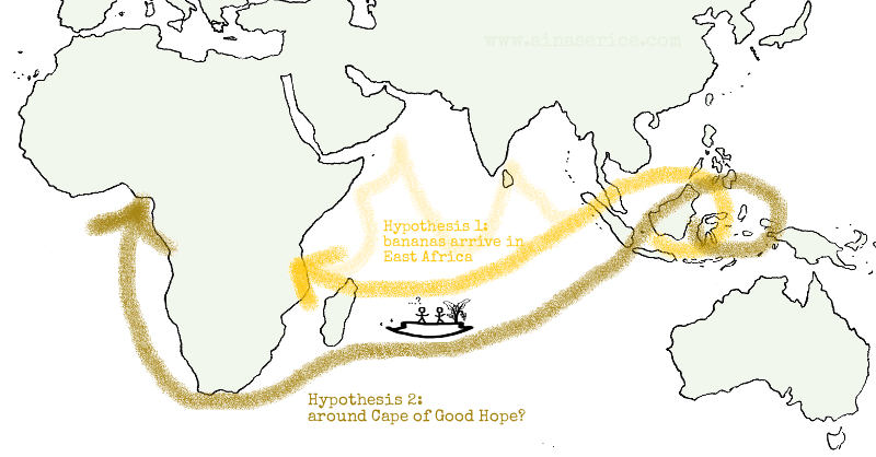 Sin embargo, mientras escarbaba en la bibliografía para saber más del matooke ugandés, me topé con un artículo que me dejó totalmente descolocada. La tesis es bastante simple, si bien sorprendente: ¿y si no hubiesen atravesado sólo el Índico? ¿Y si en realidad llegaron a bordear el Cabo de Buena Esperanza, y navegaron hasta las zonas occidentales africanas que podían acoger el cultivo de bananeros desde un buen principio? (pues no todos los climas van igual de bien a todas las tipologías de plátanos…)