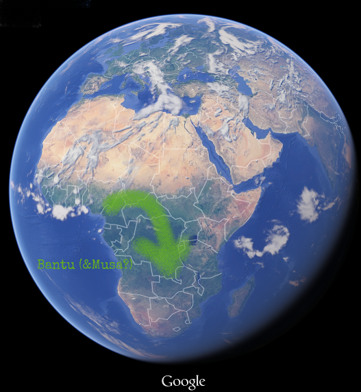 Sin embargo, me quedé asombrada al averiguar que el plátano llegó a África hace mucho, mucho tiempo. Tanto, como para que algunos consideren su presencia como fundamental para la expansión de tribus agrícolas bantúes desde zonas tropicales del África occidental, hace unos 3000-4000 años (c. 2000-1000 BC). Estas tribus, originarias del este de Nigeria y oeste del Camerún actuales, prácticamente invadieron la mayor parte del continente al sur del Sáhara, reemplazando (o absorbiendo, por matrimonio) a la mayoría de habitantes originales.