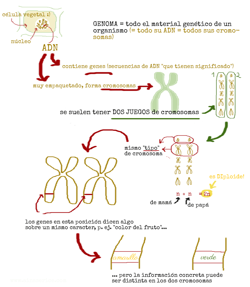 Oséase, un gen que esté situado en una posición dada en un cromosoma puede decir algo sobre cuán dulce será el fruto, pero la instrucción concreta contenida en ese gen en una planta concreta (p. ej. “muy dulce”, o “terriblemente agrio”) puede ser distinta en función del juego de cromosomas a que nos refiramos (y según la planta concreta, claro). Normalmente se hereda un juego de la madre, y otro del padre. Menos si eres una planta, como p. ej. un plátano; entonces las cosas pueden ponerse muy interesantes…