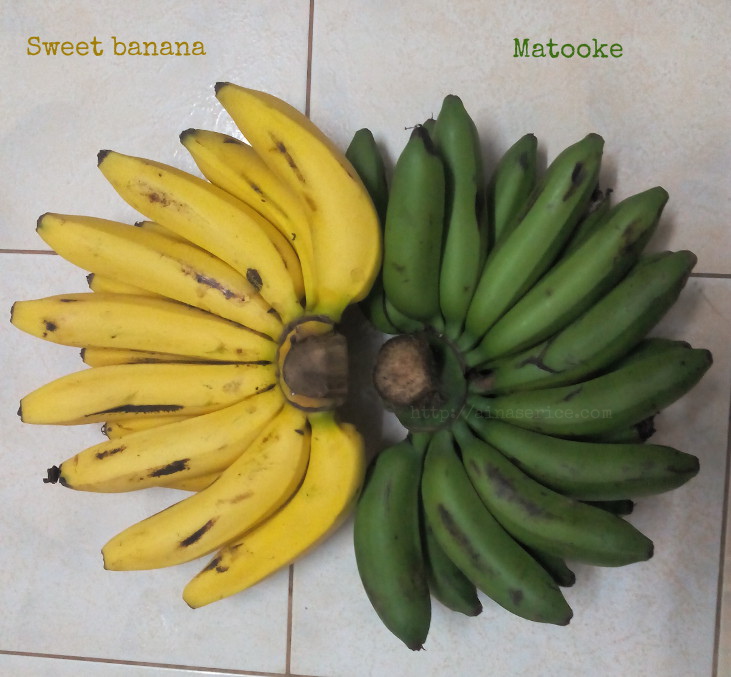a) Plátanos comúnmente llamados “bananos de tierras altas”, hijos de Musa acuminata, y por tanto con dotación genética AAA; cultivados en África oriental y central, se emplean para cocinar (como es el caso de nuestro matooke), si bien algunos cultivares se emplean para la obtención de alcohol.
