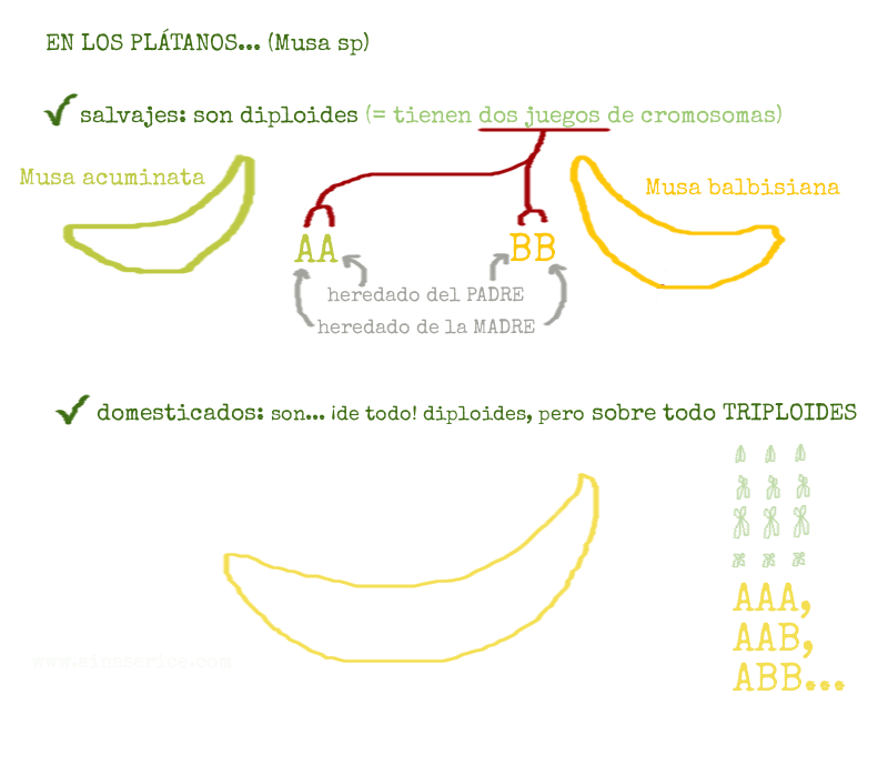 (para quienes tengan mala memoria, ello implicaría tres juegos de cromosomas: dos de M. acuminata, y uno de M. balbisiana).