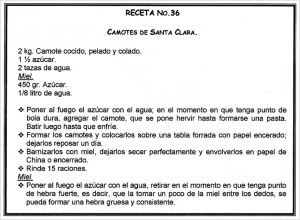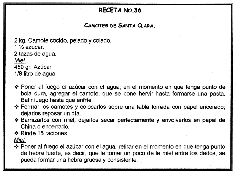 […] Puebla se lleva las palmas entre las monjas dulceras. Allí se elaboró el turrón amarillo y la leche de mamey. Fue allí donde, con la pasta almendrada de los mazapanes, se moldeó en miniatura, un apetitoso catálogo de la exuberancia de la fruta americana: mamey, piñas, zapotes, tunas, papayas, cuyo colorido exacto aún hoy invita a morderlas. Fueron famosos los tamales cernidos de Santa Mónica, así como las yemas reales, alfajores, rosquillas de almendra, polvorones, jamoncillos, guisados de pasas, camotes y dulces de las clarisas.