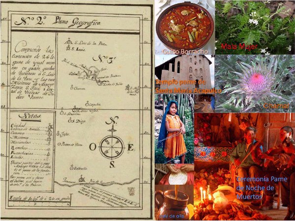 Plan geográfico de 1804 que muestra a San Luis de la Paz y las misiones de Arroyo Zarco, San José y Corral de Piedras de indios Pames al norte de la Ciudad de Querétaro. Imágenes del café de olla, el Guiso Borracho, ceremonia de Noche de Muertos celebrada en noviembre de cada año, plantas de la Mala Mujer y Chamal, niña pame, templo de Santa María Acapulco , S.L.P., trabajo de cestería.[8]