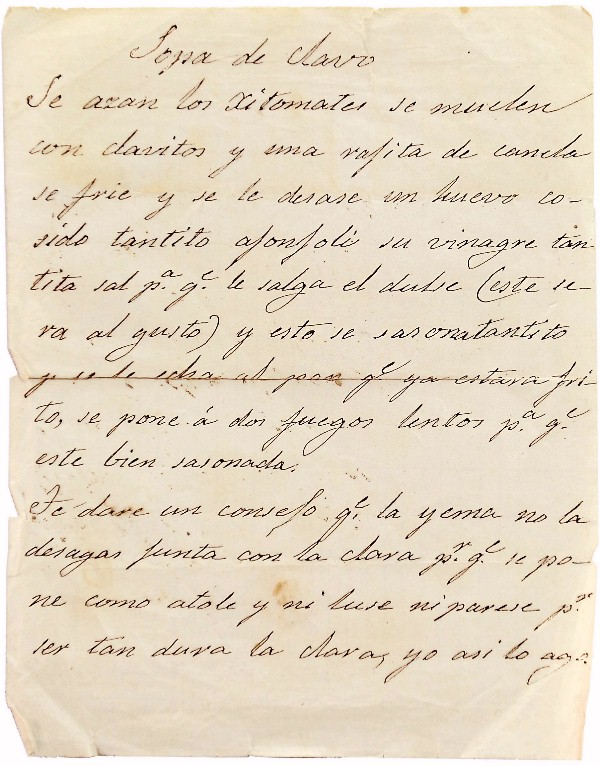 Se azan los xitomates se muelen con clavitos y una rajita de canela se frie y se le desase un huevo cosido tantito ajonjolí su vinagre tantita sal p.aq.e le salga el dulce (este sera al gusto) y esto se sasona tantito y se le echa el pan qe ya estara frito, se pone á dos fuegos lentos p.aq.e este bien sasonada. Te dare un consejo qe la yema no la desagas junta con la clara p.aq.e se pone como atole y ni luse ni paresep.r ser tan dura la clara, yo asi lo ago.”, p. 115.