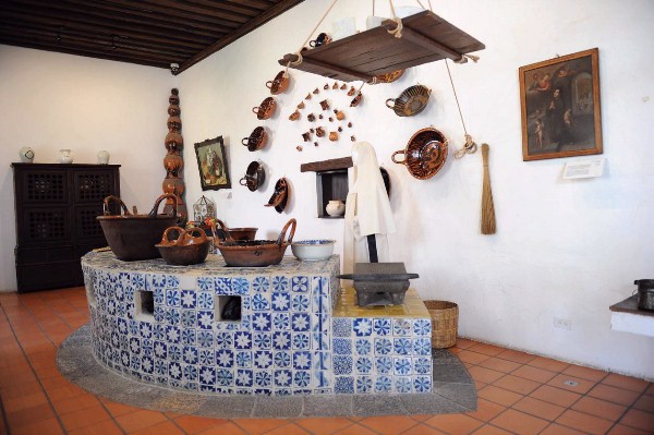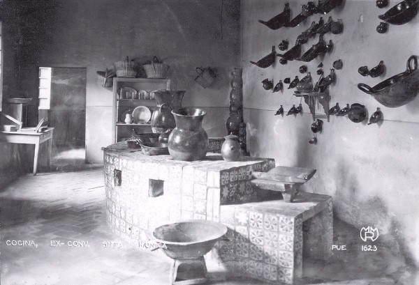 “El intercambio cultural culinario, al igual que el social, se formó con elementos de varias culturas, tal y como ya se expresó párrafos arriba. En esta recreación culinaria se mezclaron objetos de cocina como el tlecuil prehispánico (tres piedras y comal) en donde se cuecen diversos alimentos, como las masas de harina y de maíz, se tateman los chiles y se da calor uniforme a los contenidos de las ollas que se colocan en éste; como el molcajete y el metate usados para moler maíz, los chiles y los jitomates. A estos enseres se agregaron paulatinamente instrumentos foráneos como los peroles para los cocidos, el fierro en las parrillas, cucharas, tenazas y espumaderas o el cobre en diversos cazos y moldes y, conforme avanza el periodo colonial, se construirán las nuevas cocinas con poyos y parrillas incorporados, como se puede apreciar en las cocinas de los conventos de Santa Rosa y Santa Mónica, en las que el poyo servía como asiento o como repisa baja. En la foto de la cocina de Santa Mónica que acompaña el texto se observa esta creación arquitectónica.”, pp. 33-34.