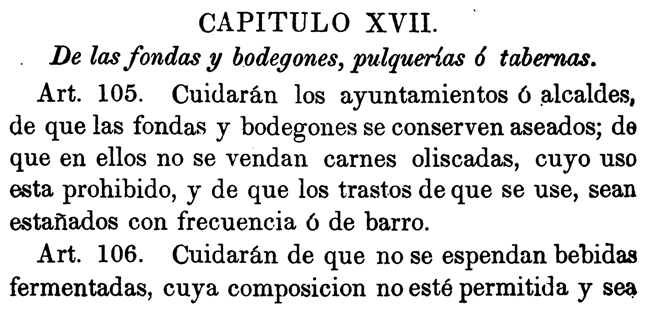 Art. 105. Cuidarán los ayuntamientos ó alcaldes, de que las fondas y bodegones se conserven aseados; de que en ellos no se vendan carnes oliscadas, cuyo uso está prohibido, y de que los trastos de que se use, sean estañados con frecuencia ó de barro.