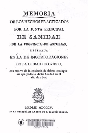 Memoria de los hechos practicados por la Junta Principal de Sanidad de Asturias, delegada en la de incorporaciones de la ciudad de Oviedo, con motivo de la epidemia de fiebre contagiosa que padeció dicha ciudad en el año 1804. Imprenta de la hija de Joaquín Ibarra, Madrid 1.805.