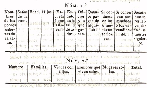 A varias personas parecía muy complicado éste plan; pero la junta ha tenido la satisfacción de llevarlo á efecto, y aun de irlo completando de año en año. Cada seis meses á la entrada de la primavera, y del invierno renuevan los celadores las listas de los pobres anotando las novedades: dichas listas se hacen en la forma siguiente.