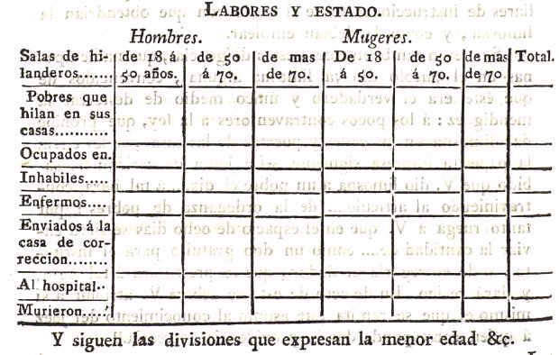 De siete partes de pobres se halló que las seis eran mujeres y niños, y que la ocupación mas proporcionada para unos y otros era el hilar; así porque esto se aprende breve, como porque la primera materia era barata, el despacho seguro (para Inglaterra), la labor propia de todos los tiempos, y que con igual beneficio la podían desempeñar los fuertes y los débiles, los ancianos y los jóvenes; y siempre que los pobres encontrasen ocupación más lucrativa podían dejar aquella.