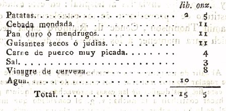 Habiendo estado bien tapada la olla no debe menguar, de dichas 15 libras y cinco onzas, más que una libra y cinco onzas, y quedarán siete raciones de á dos libras, que es más de lo que pueden consumir siete personas; y así se guarda algo para el almuerzo, merienda ó cena, sin necesidad de comer pan.
