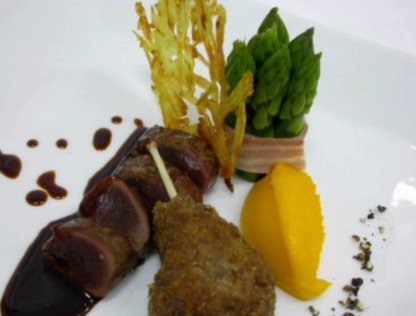 La guarnición: por un lado coceremos ligeramente los espárragos, los cuales utilizando tan solo las yemas, las albardaremos con una lámina muy fina de beicon, y la otra será un Röti de patata, el cual haremos con patata rallada sobre una sartén caliente.
