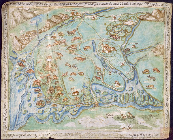 bogota1Pintura de las tierras, pantanos y anegadizos del pueblo de Bogotá hecha por mandato de la Real Audiencia desta çiudad de Sancta Fee del Nuevo Reyno de Granada en la causa que en ella trata el señor fiscal con don Francisco Maldonado de Mendoça. 1614.