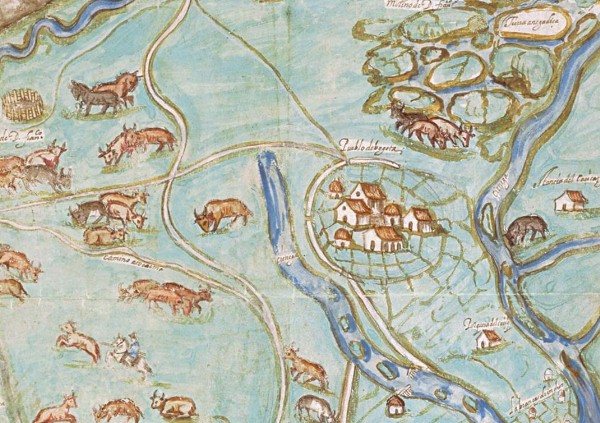 El mapa que incluyo me parece adecuado para ilustrar lo anteriormente citado porque tiene los elementos que muestran esta diversidad de los alimentos y gastronómica: molinos, labranzas, ganado porcino y vacuno de las estancias, y, además, el caballar para el transporte, y los ríos para la pesca.