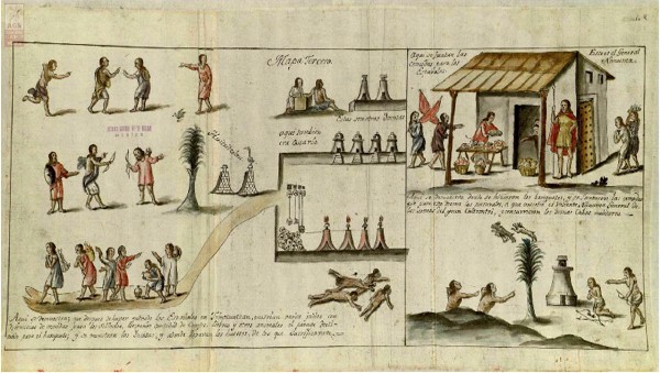 Documento colonial. Michoacán seccionado en dos: a la izquierda las yácatas y el lugar donde llevaban los huesos de los sacrificados, en el extremo contrario se encuentra el general Nanuma, quien asistió a las pitanzas que dieron los naturales. Entre la variedad de comida que se ofreció figuraban venados, conejos, liebres, codornices, aves, animales de caza, muertos y vivos, lo cual causó mucha admiración a los españoles, ya que era la mejor materia que habían visto. [3]