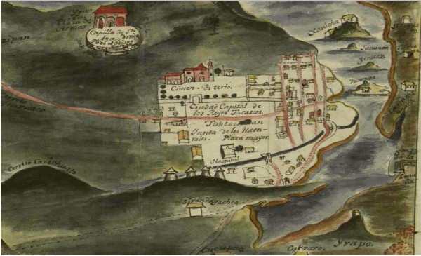 [2] Detalle de “Ciudad de Tzintzuntzan, Pátzcuaro y poblaciones de alrededor de la Laguna y la traslación de la silla episcopal a Pátzcuaro”, 1778, Colección Mapas, Planos e Ilustraciones, 280, digitalizado, Archivo General de la Nación, México.
