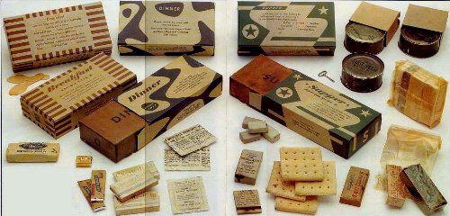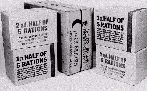 Cajas con raciones 5 y 10 en 1 Las raciones 5 en 1 fueron concebidas originalmente para los grupos motorizados de combate que funcionaban en áreas del desierto. La meta era una ración que podían preparar pequeños grupos con un equipo mínimo de cocina y mucha habilidad para cocinar. Así estas raciones estaban integradas básicamente con alimentos de la ración de B, tales como carne, leche evaporada, zumo de fruta, frutas, sopas deshidratadas, cereal, y componentes del paquete adicional como galletas, caramelos duros, sal, azúcar, cigarrillos, fósforos y papel de higiénico. Estas raciones eran embaladas en cajas de cartón y no en envases de hojalata y colocadas dentro de contenedores de madera. Cada caja en su exterior llevaba impresa el menú del que se trataba y sus ingredientes. Las raciones 5 en 1 luego se convirtieron en 10 en 1 (en realidad eran dos raciones de 5 en 1) por una cuestión de transportabilidad ya que en estos diseños no solo se trató de buscar de alimentar convenientemente a las tropas sino también de encontrar la manera de transportar los alimentos fácilmente ya sea a mano, con animales de carga o vehículos motorizados. Se estima que entre 1943 y el final de la Segunda Guerra Mundial se habían fabricado 300 millones de raciones 10 en 1 al costo de 85 céntimos de dólar cada una NORMANDÍA